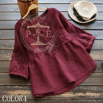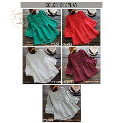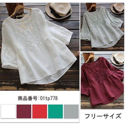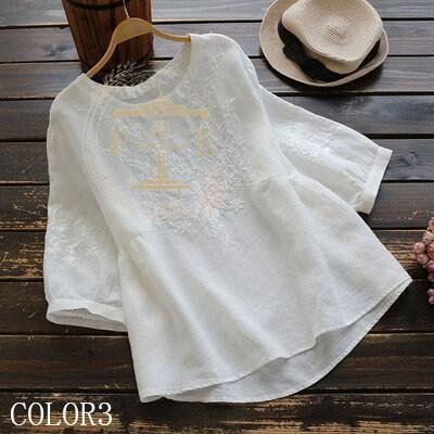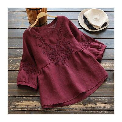 【人気商品超目玉】ブラウス レディース 春夏 リネン 刺繍 トップス チュニック 半袖 ラウンドネック 無地 体型カバー ゆったり 大きいサイズ プルオーバー カットソー お洒落