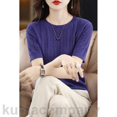 トップス ニット カットソー サマーニット レースニット 透かし編み エレガント レディース きれいめ カジュアル おしゃれ 半袖 大人 可愛い フェミニン クルーネック シンプル パープル