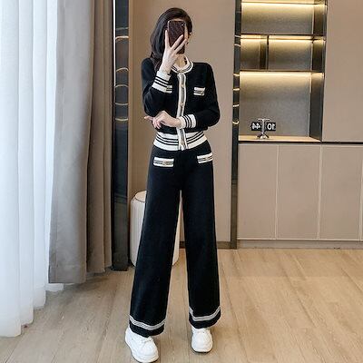 ブランドニットセットアップニットトップスワイドパンツ ハイウエスト着痩せ効果パンツ韓国ファッションレディース春服上下二点セットアップ