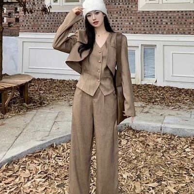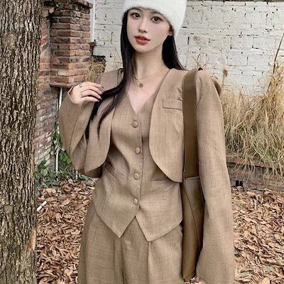 セットアップ甘くてクールなスタイルのショートスモールスーツジャケット+ベスト+ワイドレッグパンツレディース2024新作ファッション3点セット