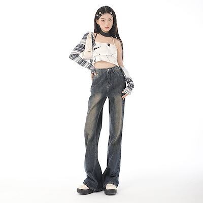 アメリカンレトロ旧ゆったり感ストレートパンツ新型ワイド脚マイクロフレアジーンズ 女 脚長効果!スキニーデニムパンツ ダメージ ロングパンツ レディース ワイドパンツ