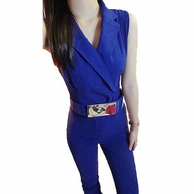 オールインワン 青ML即納 ベルト付 7分丈 クロップド ノースリーブ カシュクール 18920