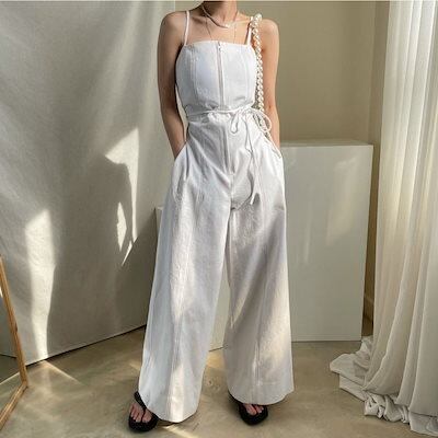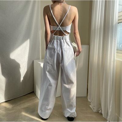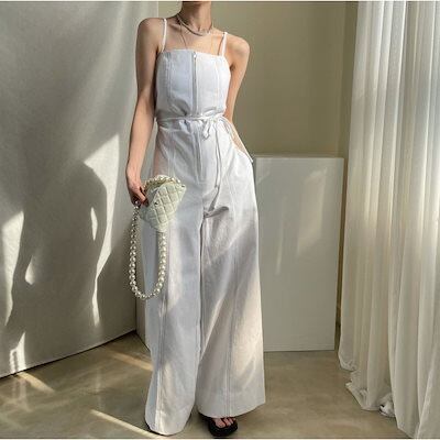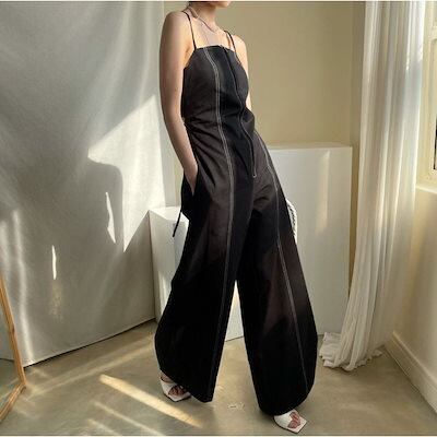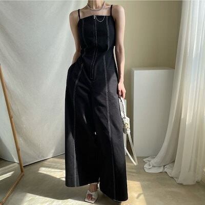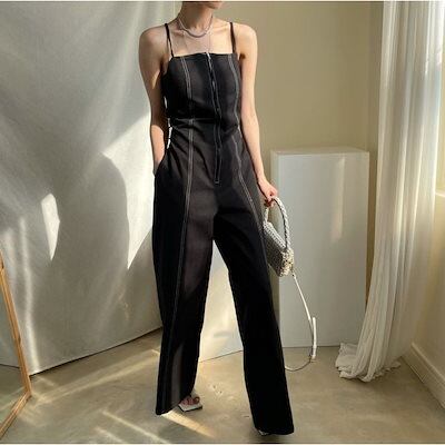 オールインワン ステッチラインキャミソールオールインワンパンツ レディース ジャンプスーツ オーバーオール ジッパー ダブルポケット ベアトップ パンツオールインワン サロペット ワイドパンツ