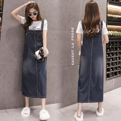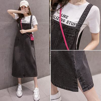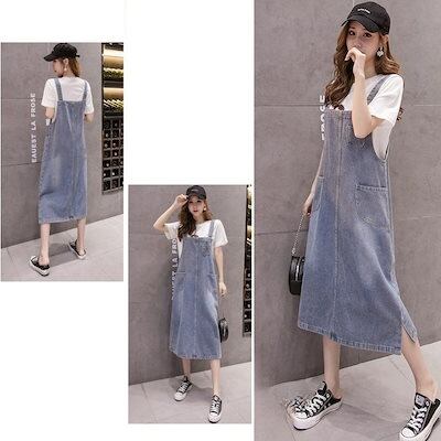 デニムサロペット ジャンパースカート レディース 大きいサイズ スリット ポケット付き ロング カジュアル サスペンダーデニムスカート サロペットスカート オーバーオール ミモレ丈