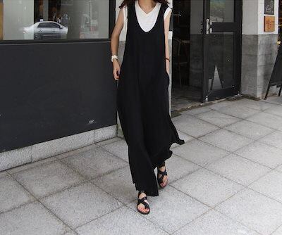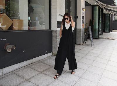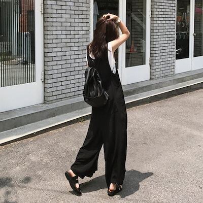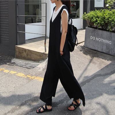 S_S.ILオールインワン レディース サロペット オーバーオール ジャンプスーツ ブラック 黒 春 夏 S M L XL 無地 Vネック 袖なし ノースリーブ ワイドレッグ パンツ ワイドパンツ