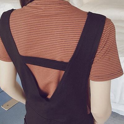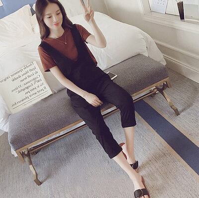 Tシャツ 半袖 ラウンドネック オーバーオール 9分丈 ブラック 2点セット レディース 夏 無地 体型 カバー 休日 お出かけ コーデ 普段使い 楽ちん 学生 通学 着回し お洒落 カジュアル