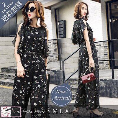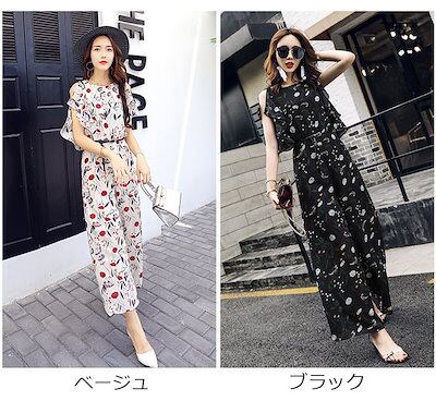 オールインワンレディースシフォンパンツドレスワイドガウチョパンツ花柄エレガントカジュアルファッションおしゃれきれいめ
