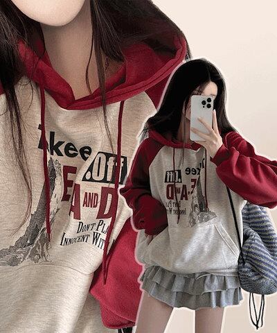 [オーバーフィット/ふんわり起毛] デイリー Y2Kムードナグラン 配色 プリント パーカー (5color)