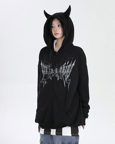 Y2K長袖パーカーレディースパーカー大きいサイズ悪魔地雷レイヤード風パーカーアニメ可愛い悪魔しっぽレディースメンズ病みかわいい 量産型原宿病みかわ高校生通学通勤個性学生メンヘラおしゃれゆったりアウター