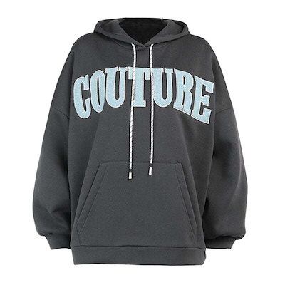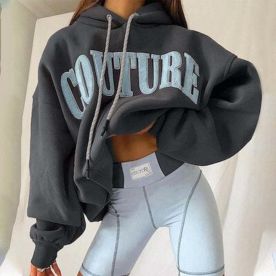 女性Y2Kレタープリントルーズパーカーグレーパーカー