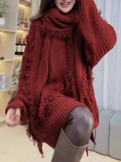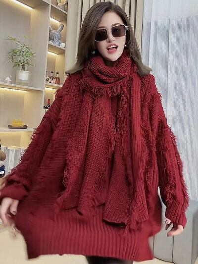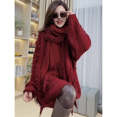 おしゃれ フリンジ セーター マフラー付き 2点セット レディース 怠惰風 トップス 長袖ニット Vネック プルオーバー