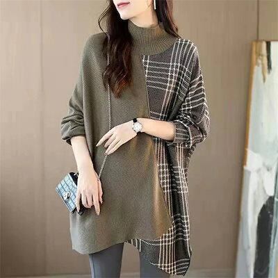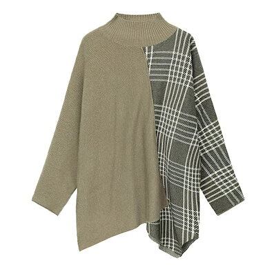 ハイゲージニット ック ニット ドルマン レディース ドロップショルダー チュニック ドッキング セーター ドルマンスリーブ ニットセーター ハイゲージ 切り替え チェック柄 チェッ