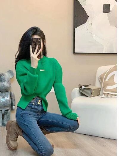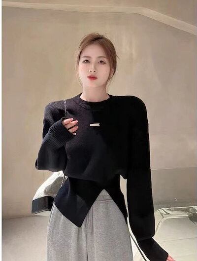 感 気質 クラインブルー セーター レディース バブル袖 デザインセンス スリット 不規則 トップス