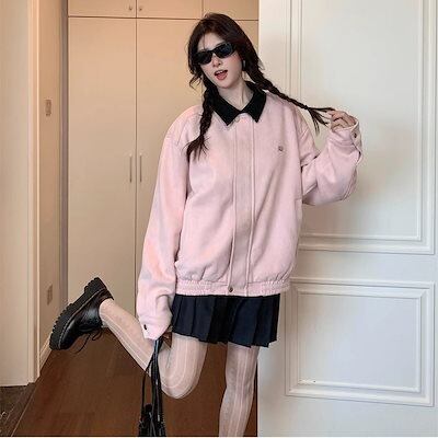 長袖 ピンク ジャケット ジャンパー 折り襟 スタジャン ゆったり トップス アウター レディース 春 秋 カジュアル ファッション
