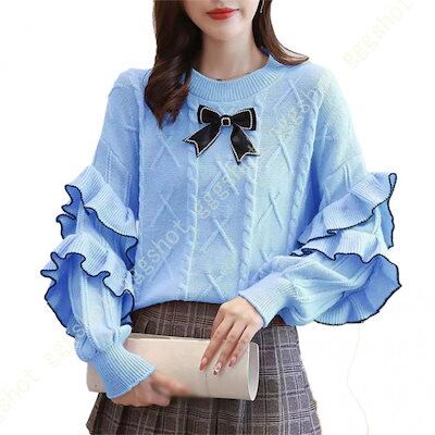 ニット レディース トップス キレイめ セーター オーバーサイズ 体型カバー 蝶結び 秋ニット パフスリーブ ドルマンスリーブ 長袖 大人 セーター 長袖ニット