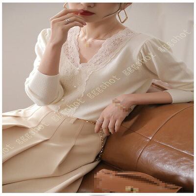 ニット Vネック 長袖 プルオーバー セーター レディース 小顔効果 上品 レース ストレッチ 伸縮性 着痩せ効果 セーター トップス 体型カバー レースセーター
