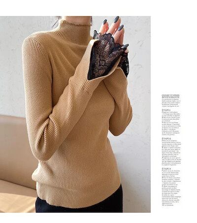 ニットトップス レディース 秋 冬 ハイネック ニットセーター レディース リブニットトップス 長袖 細見 ニットソー スリムフィット フェミニン 袖レース 30代 40代 50代