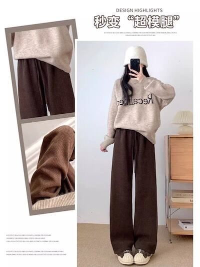 2024秋冬 防寒 あったか 2TYPE 厚手パンツロング丈ストレートハイウエストゆったり 脚長美脚細見え春カジュアル黒白韓国系ファッションレディースおしゃれ かわいい衣装トラック