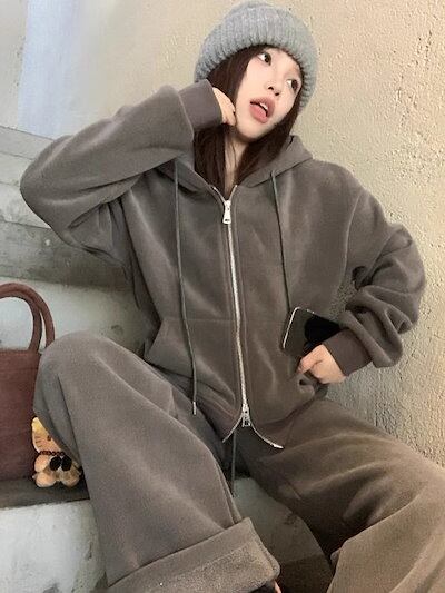 2024秋冬 韓国 かわいい レディース 無地 フード付き長袖アウターレトロセット黑白フーディーダブルサイズ丈トップス春カジュアルスポーツファッション系通学学生袖お出かけアップシルエットトラック羽織り
