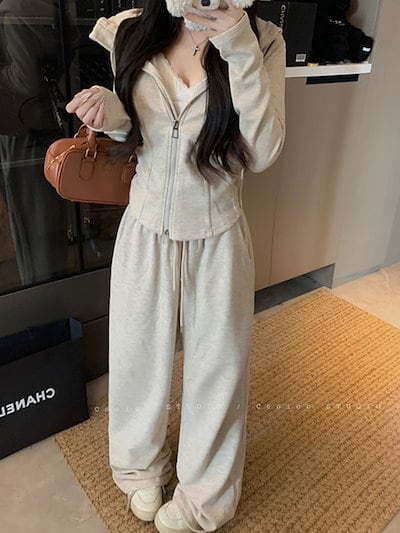 2024 秋冬 韓国 かわいい レディース 無地フード付き長袖アウターレトロセット黑白フーディーダブルサイズ丈トップス春カジュアルスポーツファッション系通学学生袖お出かけアップシルエットトラック羽織り