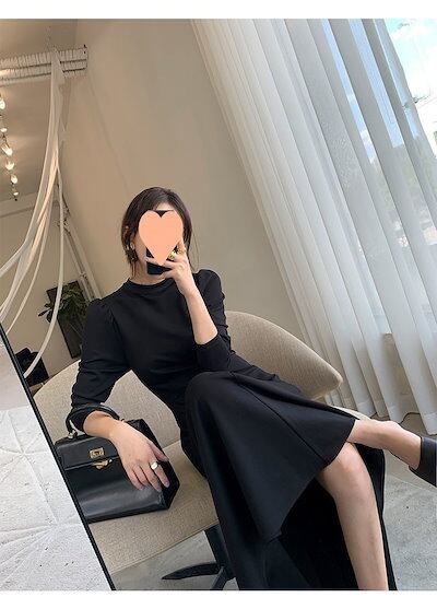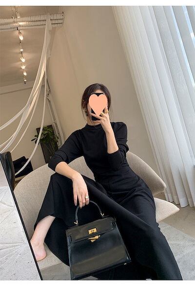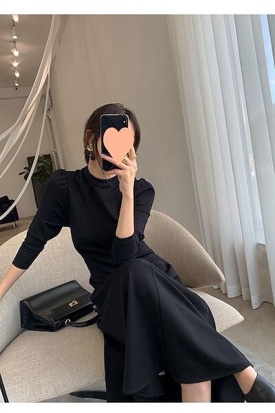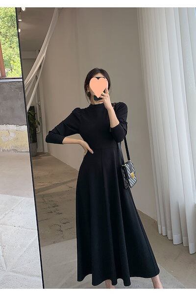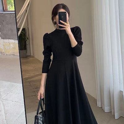 フレアロングワンピース ロングワンピース シック 黒 フォーマル パフスリーブ フレア 七分袖 ハイウエスト 韓国 レディース オルチャン ハイネック ミモレ丈 セレモニー 高級感 高見え