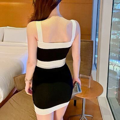 ミニタイトワンピース タイトワンピース ワンピース ミニ丈 細身 胸元 ウエストマーク 韓国 レディース オルチャン バイカラー 袖なし スリム タイト 可愛い かわいい 大人可愛い 大人