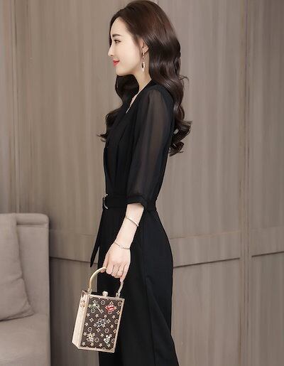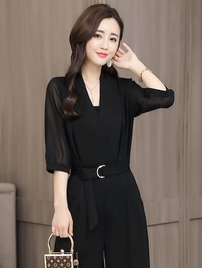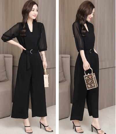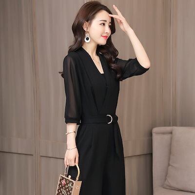 ジャンプスーツ パンツ ドレープ Vネック 五分袖 シフォン ポケット ルーズ 韓国 レディース かわいい 可愛い キュート 大人可愛い 大人女子 シンプル きれいめ カジュアル 大人 気品