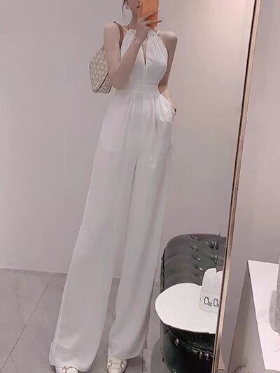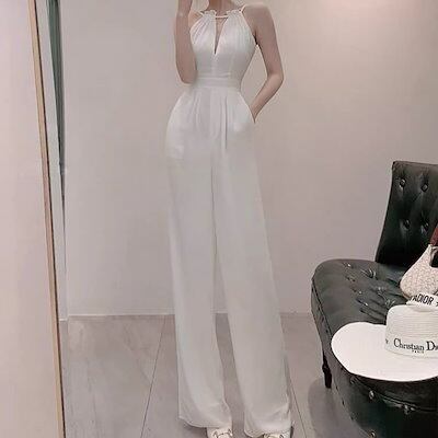 ホルターネックハイウエストジャンプスーツ レディース オールインワン スリム 細身 ストレート #オフショルダー ホルターネック #ワイドレッグパンツ #ハイウエスト #ジャンプスーツ