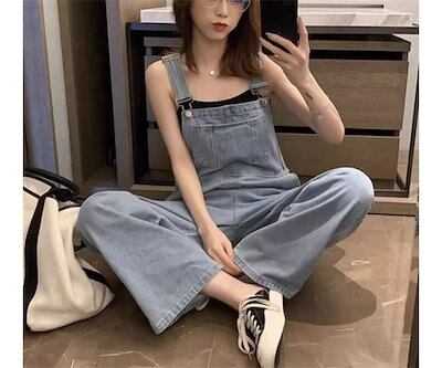 レディース パンツ ボトムス オーバーオール フルレングス 袖なし ノースリーブ ワイド ファスナー ポケット ハイウエスト デニム ブルーデニム かわいい 大人可愛い シンプル カジュアル おしゃれ