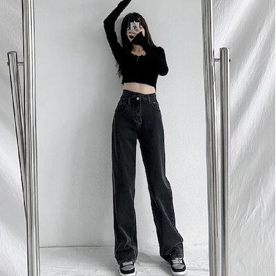 脚長効果!デニムパンツ イレギュラーゆったりストレートデニムパンツ レディース百掛けハイウエストスリムワイドパンツ