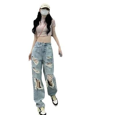 脚長効果!ダメージデニムズボン レディース 夏スリム見えハイウエスト膝丈ワイドパンツ