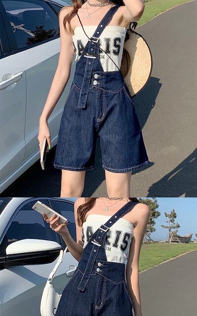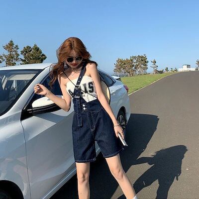 年齢を下げる韓版ゆったりワイドレッグ デニム オーバーオール ショーツ レディース 夏 大きいサイズ ファット ワンショルダー サスペンダー ジャンプスーツ