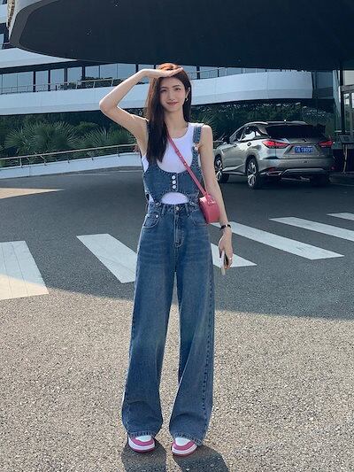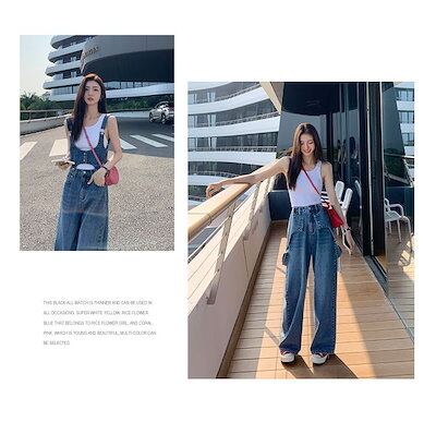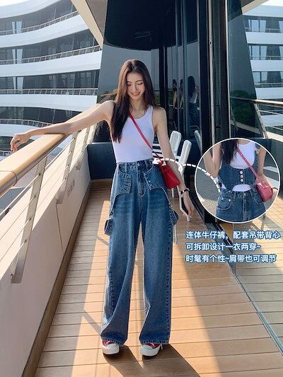取り外し可能なデニム オーバーオール レディース 2 点セット 2024 デザイン ルーズ ジャンプスーツ ワイド パンツ