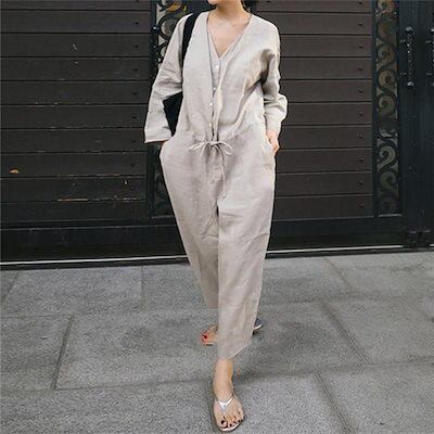 オールイン レディース つなぎ サ 春物 ガウチョパンツ オーバーオール ワイトパンツ ン 綿麻風 Vネック 長袖