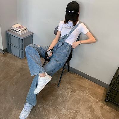 イレギュラーワンショルダー リップドデニム オーバーオール レディース デザイン 細見え ハイウエスト ワイドパンツ トレンド
