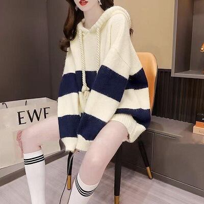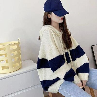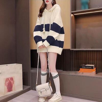 ニットパーカー ボーダー柄レディース韓国