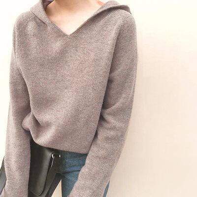 フード付き ニットトップス レディース Vネック ニットセーター 長袖 シンプル ニットパーカー プルオーバー 秋冬