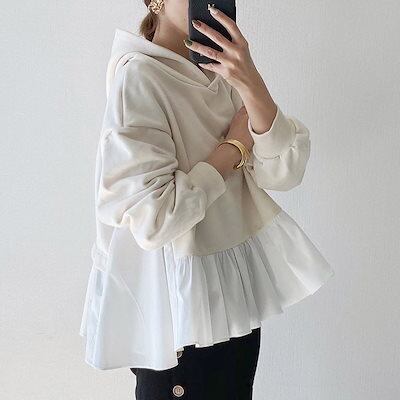 【韓国の人気爆発】 フリル飾り フード付き 切り替え トップス パーカー レディース