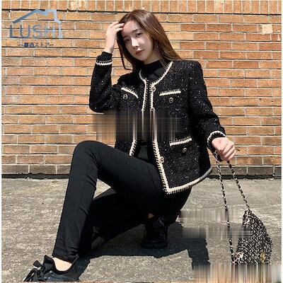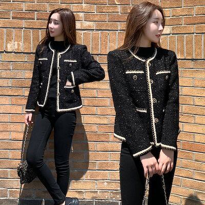 製品 気質 ツイードジャケット レディース 長袖ノーカラージャケット 黒 ツイードコート アウター 秋服 大人韓国風 通勤 結婚式 入学式 卒業式
