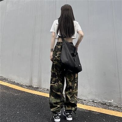 かっこいい!スラックスパンツワイドパンツシルエットで魅せる 超 ワイド 迷彩 カーゴパンツ ダボかわ ストリート メンズライク ワイルド カジュアル 裾ドローコード バギーパンツ 古着