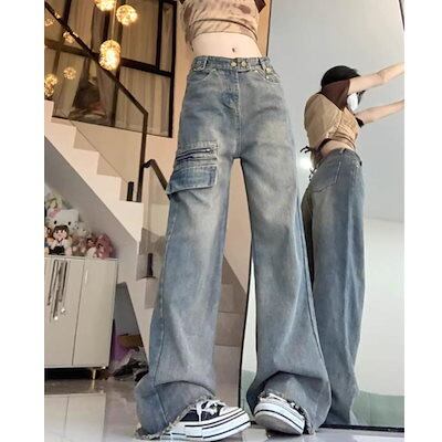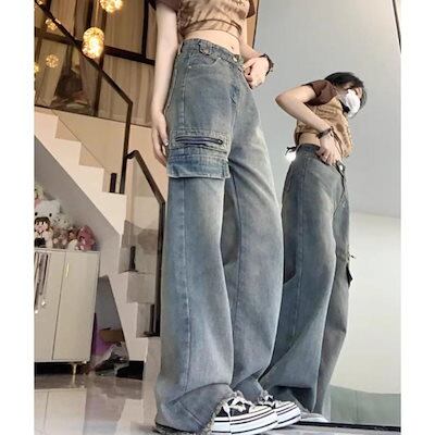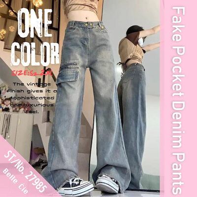デニムパンツ デニムパンツ ワイドパンツ フェイク ポケット ミリタリー バギー レディース 韓国ファッション カットオフ ヒップホップ ダンス ワンポイント