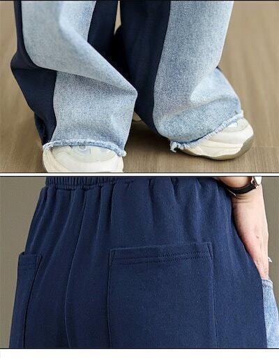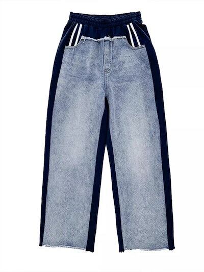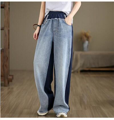 ワイドデニムパンツ 切替 ワイドパンツ レディース スウェット パンツ 春秋 ロングパンツ デニムパンツ ジーンズ ボトムス リラックス ウエストゴム ジーパン バギーパンツ イージーパンツ ゆった
