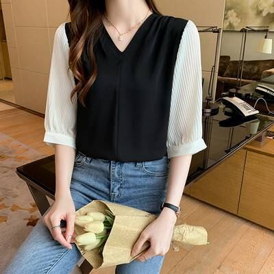 トップス レディース ブラウス カットソー 五分袖 春 夏 ブラック Vネック 重ね着風 休日今日は30パーセント