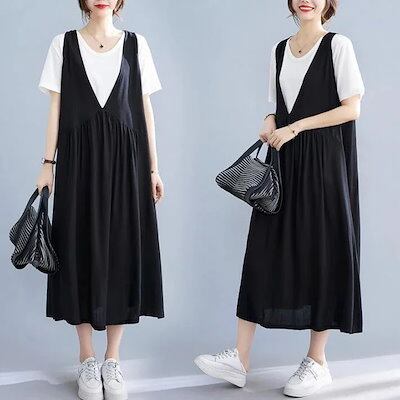 2点セット セットアップ Tシャツ ギャザーワンピース タンクワンピース 大きいサイズ ロングワンピース 半袖 Vネック 重ね着 ロング マキシ丈 レディース シンプル 大きめ 春 夏 L 2L今