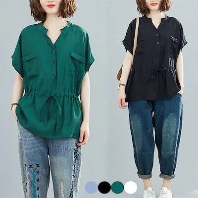 リネンブラウス ドルマン ブラウス スタンドカラ- ドルマンブラウス ブラウジングブラウス シャツ トップス レディース 半袖 大きめ ゆったり 綿麻素材今日は30パーセント