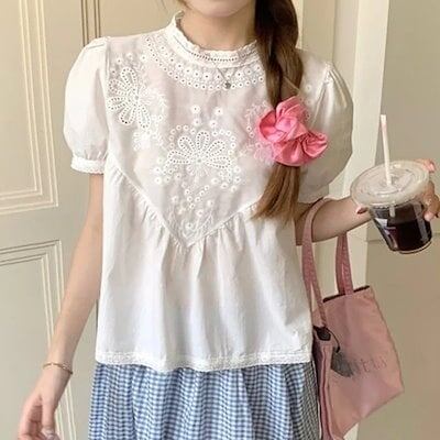 2024 春夏トップス シャツ 半袖 バブル袖 ゆったり 細見え 夏 白 ホワイト カジュアル おしゃれ かわいい キュート 韓国ファッション レディース お出かけ安い