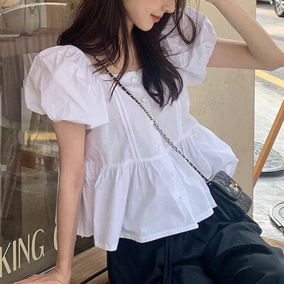 2024春夏トップス シャツ ブラウス スクエアネック 半袖 バブル袖 細見え 夏 白 黒 カジュアル おしゃれ かわいい キュート 韓国ファッション レディース お出かけ安い