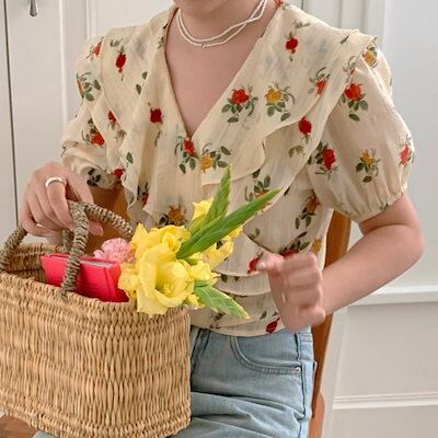 2024 夏 韓国トップス シャツ Vネック 花柄 赤い花 半袖 ゆったり 細見え 夏 キュート 甘め おしゃれ かわいい 韓国ファッション レディース お出かけ安い