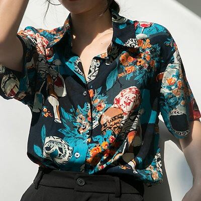 シャツ 古着 花柄シャツ ブラウス 半袖 トップス レディース 開襟 油絵 通勤 通学 カジュアル