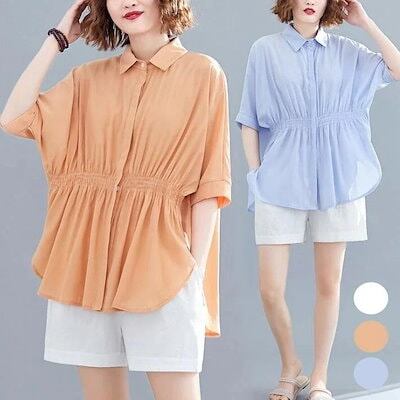 ドルマンシャツ ブラウジング シャツ ブラウス フレンチスリーブ レディース 半袖 5分袖 大きめ オーバサイズ ゆったりサイズ 体型カバー 透け 涼しい 夏